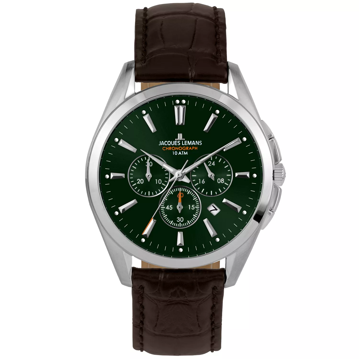 Jacques Lemans 1-1945.1C muški kronografski sat iz kolekcije Derby. Sat se odlikuje klasičnim dizajnom sa zelenim brojčanikom i smeđim kožnim remenom. Mehanizam sata je kvarcni, a vodootpornost je 10 bara.