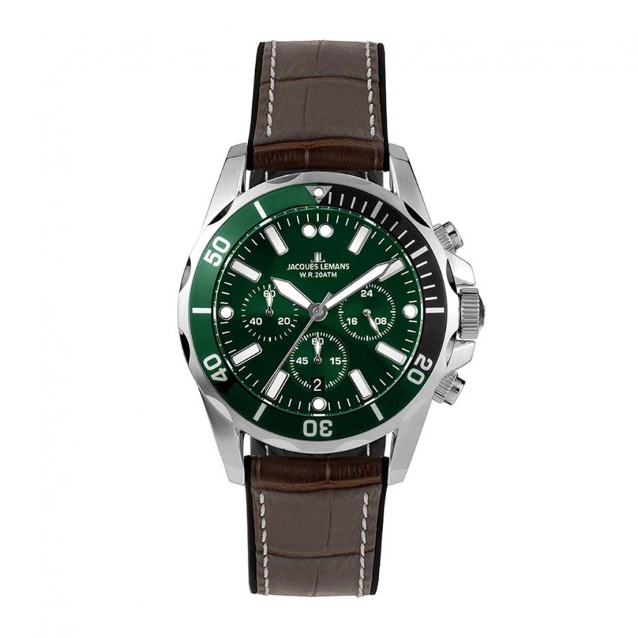 Jacques Lemans 1-2091C je muški sportski sat iz serije Liverpool Chronograph, sa srebrnim kućištem od nehrđajućeg čelika, zelenim brojčanikom i smeđim remenom s prevlakom od reljefne kože krokodilske boje. Ovaj sat s kvarcnim mehanizmom ima kronograf, datum i 24-satni prikaz te je vodootporan do 200 metara.