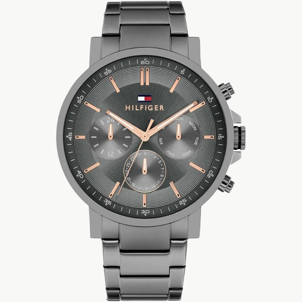 Tommy Hilfiger 1710711 iz serije Tyson je moderan muški ručni sat koji kombinira sportsku eleganciju s funkcionalnim dizajnom, prepoznatljiv po svojoj tamno sivoj boji i multifunkcionalnom brojčaniku.