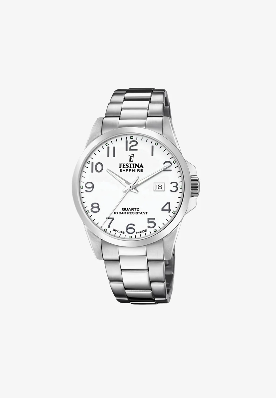 Festina 20024-1 muški sat iz kolekcije Swiss Made, koji izvrsno spaja vrhunsku švicarsku izradu, klasični dizajn i funkcionalnost. Idealan izbor za muškarce koji žele sat koji izgleda sofisticirano i pouzdano, te se može nositi u raznim prilikama, od poslovnih do casual. Bijeli / srebrni brojčanik s jasnim i čistim linijama daje profinjen i klasičan izgled. Čelična narukvica u srebrnoj boji čini sat univerzalnim — dobro pristaje uz odijelo, ali i uz svakodnevni casual stil. Tanak profil kućišta (oko 9-10 mm) omogućuje udobno nošenje i ispod manšeta košulje.
