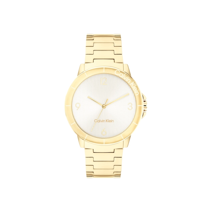 Calvin Klein 25100023 ženski sat je izvrstan za osobu koja traži izvanredan vremenski okvir. Sat ima kućište od nehrđajućeg čelika širine 36 mm i debljine 9,5 mm sa zlatnom završnom obradom. Narukvica je također izrađena od izdržljivog nehrđajućeg čelika. Minimalistički brojčanik ima mineralno staklo i numeričke indekse na 3, 6, 9 i 12 sati, s Calvin Klein logotipom na okviru. Sat je vodootporan do 30 m/3 atm, što znači da je otporan na prskanje, ali se ne preporučuje za plivanje.