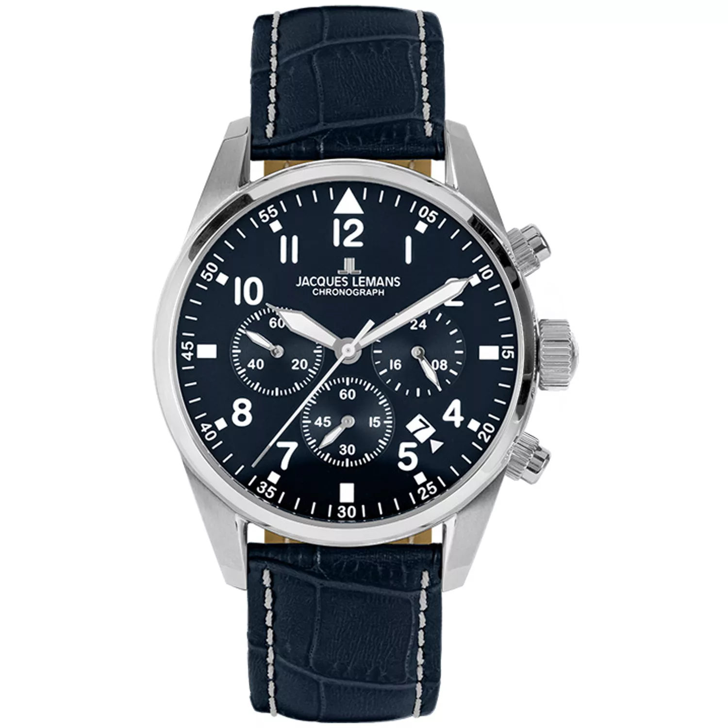 Jacques Lemans 42-2B je muški kronografski sat iz serije Barcelona, sportskog dizajna s plavim brojčanikom i plavim kožnim remenom. Mehanizam sata je kvarcni, a sat je vodootporan do 10 bara.
