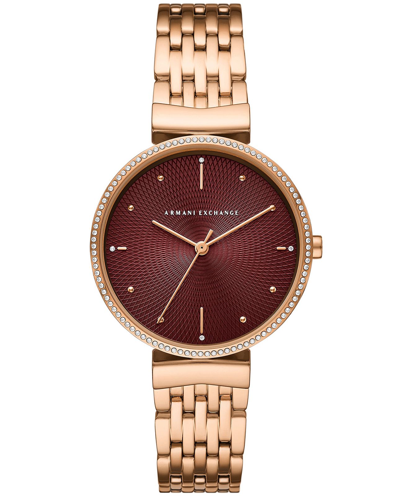 Armani Exchange AX5912 je ženski analogni sat iz kolekcije Zoe, s narukvicom od nehrđajućeg čelika u boji ružičastog zlata i upečatljivim crvenim, teksturiranim brojčanikom.