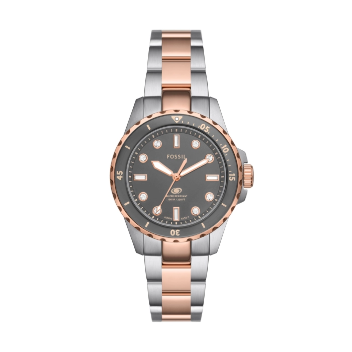 Fossil ES5348 je ženski ručni sat od nehrđajućeg čelika u dvije boje iz kolekcije Blue Dive, s kvarcnim mehanizmom, kućištem od 36 mm, sivim brojčanikom i vodootpornošću od 10 bara. Dizajn uključuje jednosmjerno rotirajući okvir, geometrijske kristalne indekse, svjetleće kazaljke i markere te mineralno staklo.