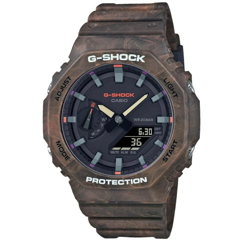 Casio G-Shock GA-2100FR-5AER je robustan, tanak i lagan sat iz “Mystic Forest” serije, poznat po svojoj Carbon Core Guard strukturi i kombinaciji analogno-digitalnog prikaza. Dizajniran je da bude otporan na udarce i vodu do 200 metara, a ističe se svojim jedinstvenim smeđim i narančastim kovitlastim bojama.