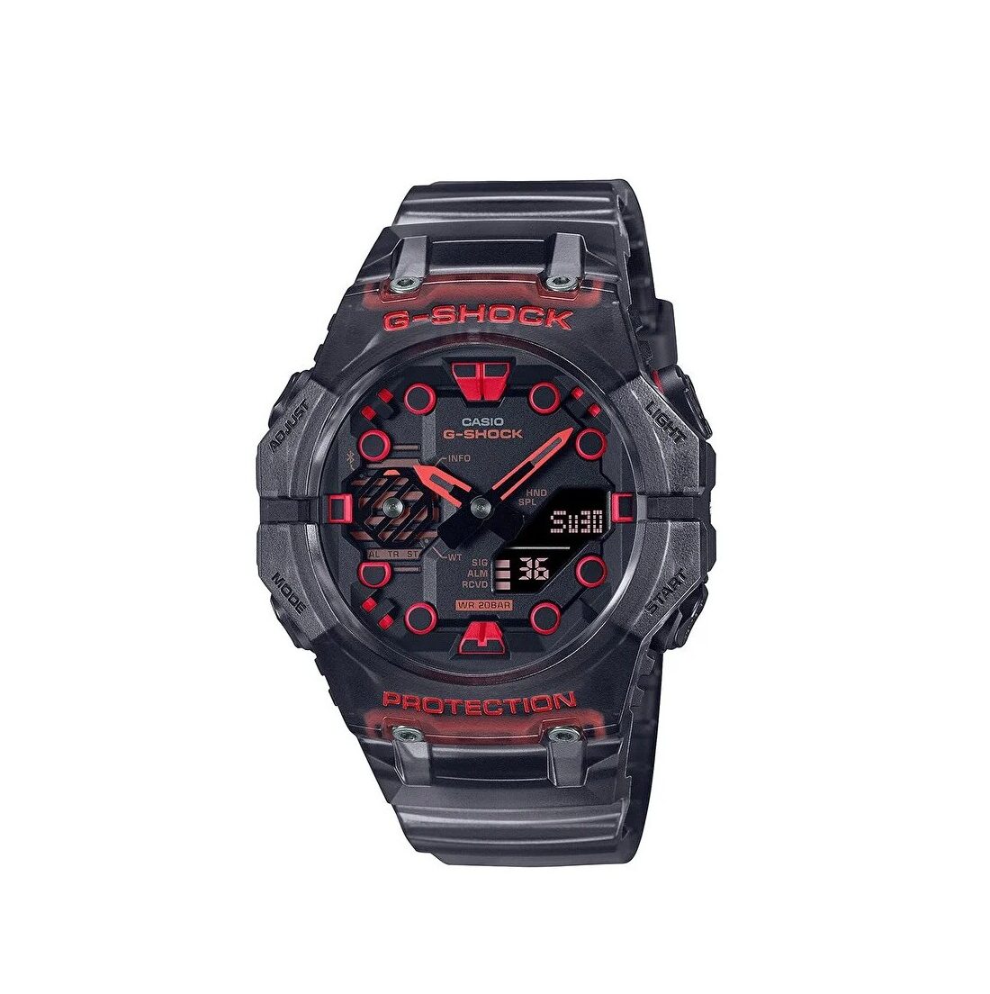 Casio G-Shock GA-B001G-1AER je robustan, analogno-digitalni sat inovativnog dizajna, koji se ističe Carbon Core Guard strukturom i Bluetooth povezivosti za sinkronizaciju s pametnim telefonom. Dizajn ovog modela karakterizira inovativna dvodijelna konstrukcija okvira, gdje se gornja i donja komponenta spajaju na pozicijama 9 i 3 sata, prateći liniju zapešća za bolje prianjanje. Boje okvira i remena su prozirne (sivo-crne sa crvenim detaljima), stvarajući dojam “bliske budućnosti” i izlažući unutarnje dijelove kućišta.