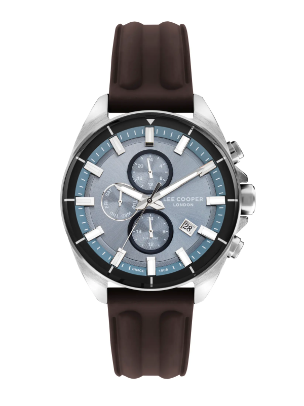 Lee Cooper LC07881.394 muški ručni sat je moderan multifunkcionalni model koji spaja sportski dizajn i funkcionalnost, prepoznatljiv po plavom brojčaniku i smeđem silikonskom remenu.