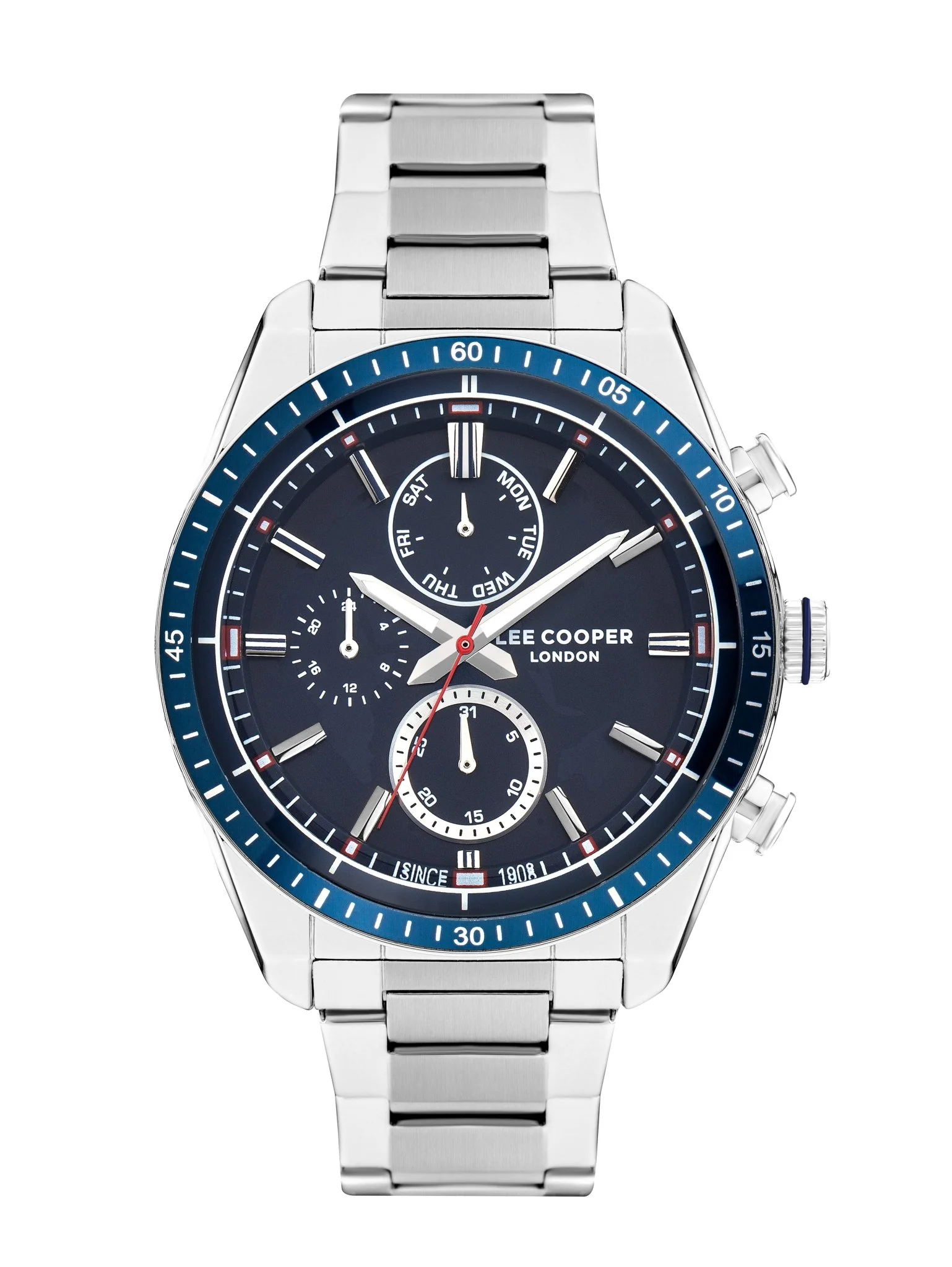 Lee Cooper LC07949.390 je elegantan muški multifunkcionalni ručni sat s tamnoplavim analognim brojčanikom i robusnim srebrnim metalnim remenom. Ima kućište od supermetala, japanski kvarcni mehanizam i vodootpornost do 5 bara. Moderan dizajn s naglašenim detaljima čini ga idealnim za svakodnevno nošenje.