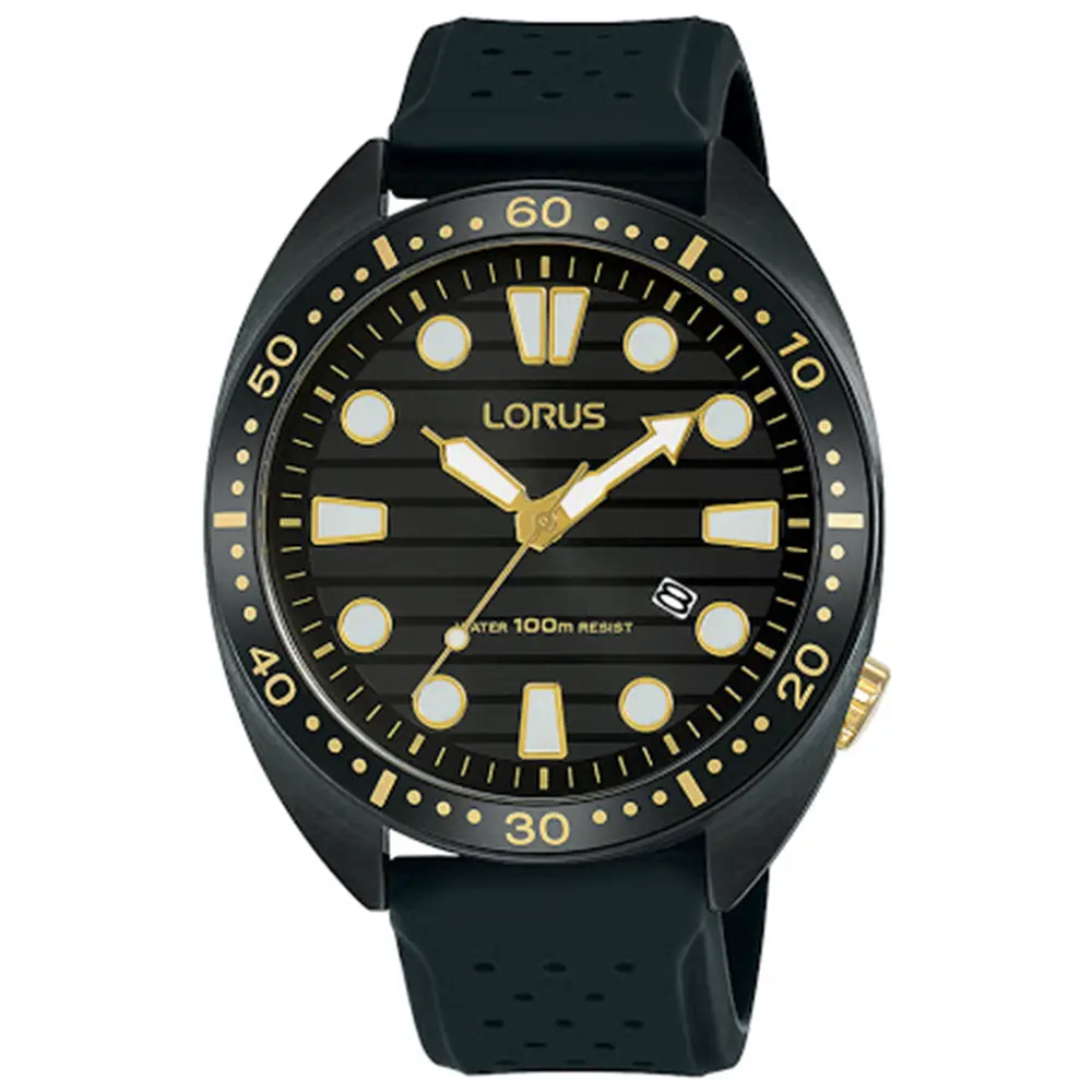 Lorus RH927LX-9 je muški sportski analogni sat s kvarcnim mehanizmom, kućištem od nehrđajućeg čelika i crnim silikonskim remenom. Vodootpornost sata je 10 bara.