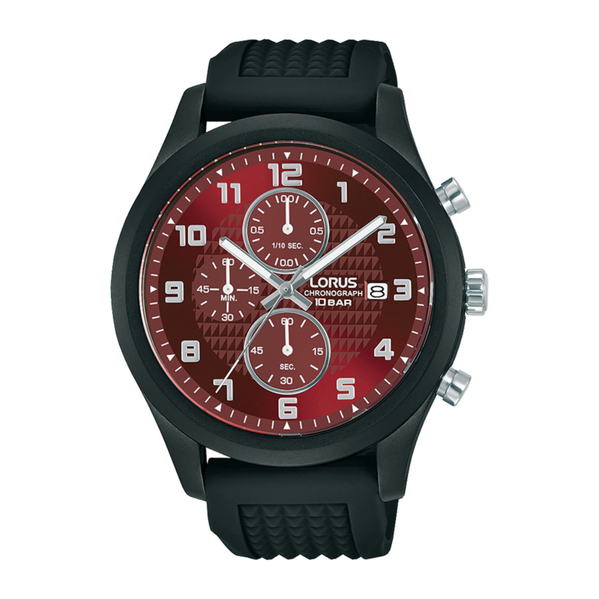Lorus RM391GX-9 je muški sportski ručni sat s kvarcnim mehanizmom i funkcijama kronografa i datuma. Karakterizira ga upečatljiva crno-crvena kombinacija boja i robusna konstrukcija.